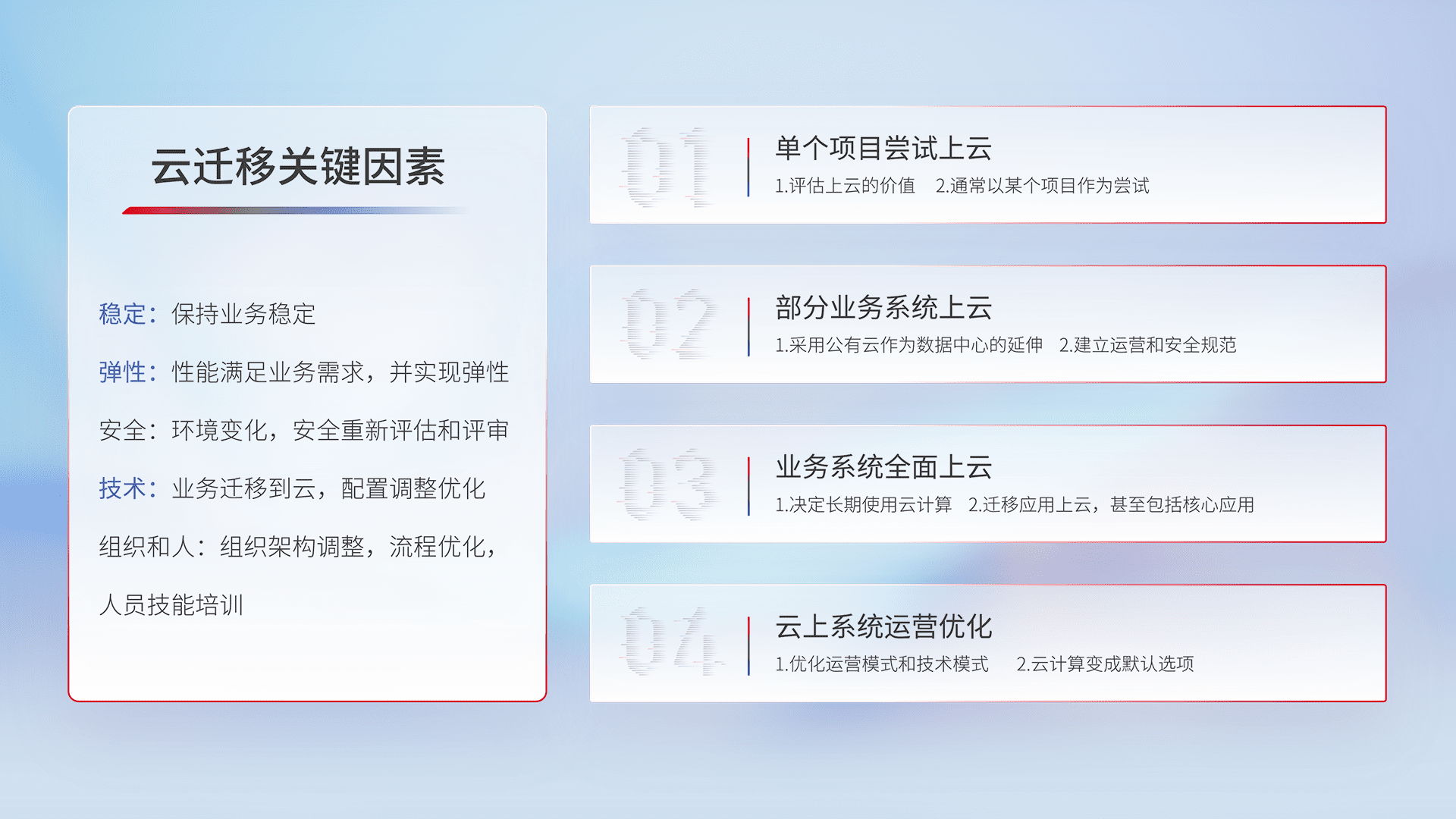 结合实际业务,,从规划设计、、、云平台选型、、、云原生改造、、、数据迁移、、、、集成交付,,迁移全过程为客户识别最佳上云路径,,做好风险识别管理,,,,设计网络架构、、、身份权限、、、安全审计合规、、、操作审计、、、、日志审计、、监控告警策略、、、多站点容灾设计等,,,对云上基础设施进行整体规划,,,,提升IT治理水平,,,,以满足弹性、、、高可用、、、、高性能的需求。。。。