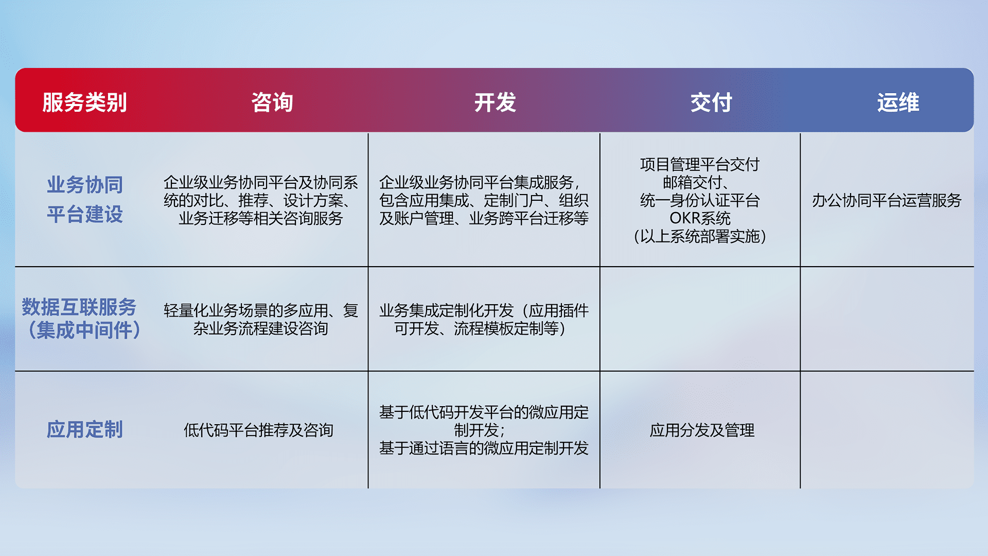 针对钉钉、、、企微、、IDaas等平台级产品提供产品的规划、、方案、、、交付、、定制化开发等服务,,,,实现如统一协同办公、、智能客户服务、、、混合会议管理、、、、智能数据查询、、、、等业务场景,,,,实现数字化转型。。。。